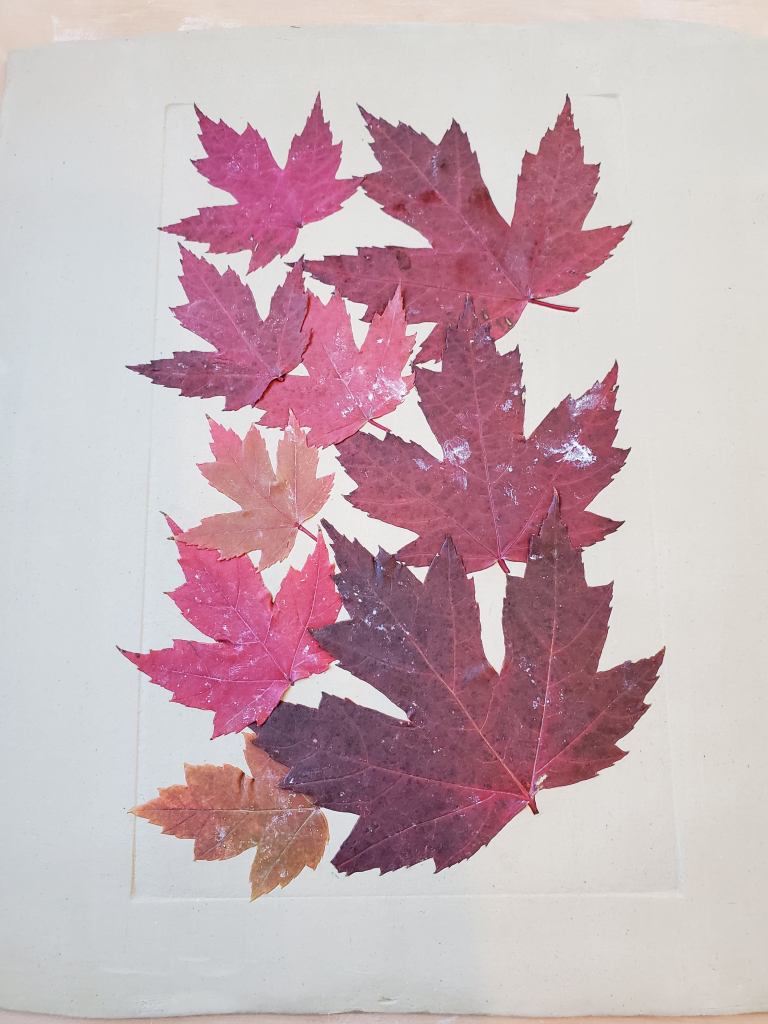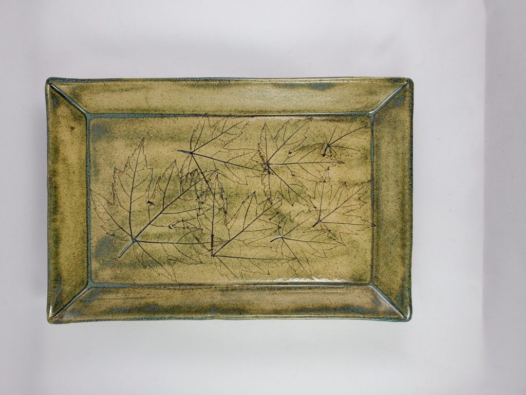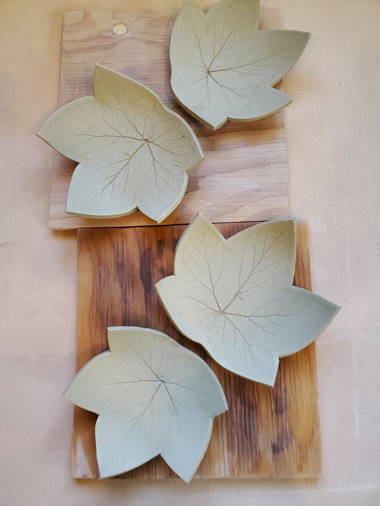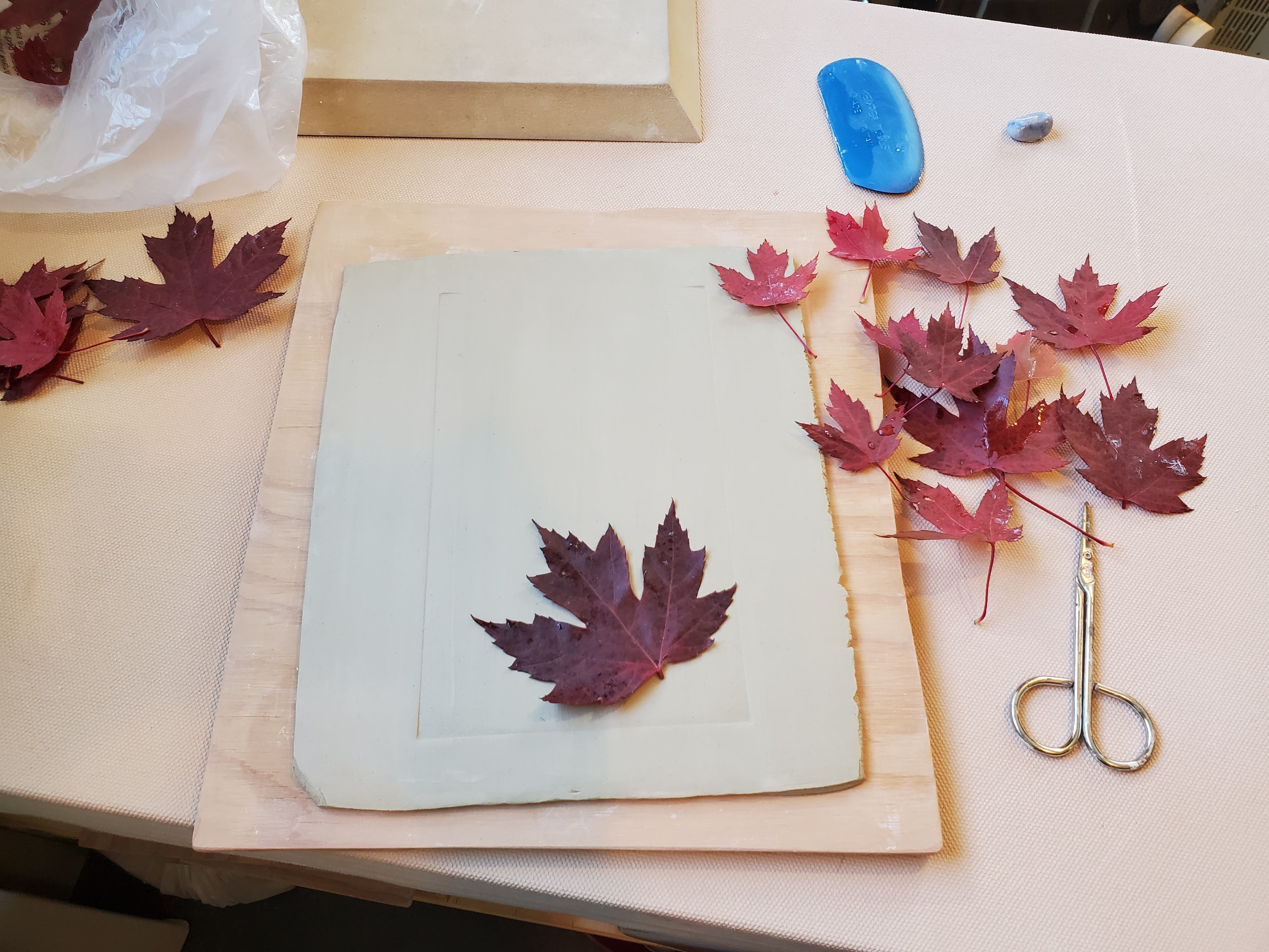 The first step is to walk around the property and collect leaves. I’ve been using maple, thimble berry and yarrow leaves. Then I roll out a slab of clay and smooth and compress it before placing the leaves on it and rolling over it again with a rolling pin. It turns out that clay slabs are super finicky and any rough treatment will come back to haunt you during firing! So much warping! After the first firing I paint an underglaze on to the surface and then wipe it almost completely off, so that the color remains only in the texture and leaf veins. The final step is an all over application of translucent green glaze.