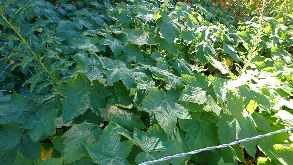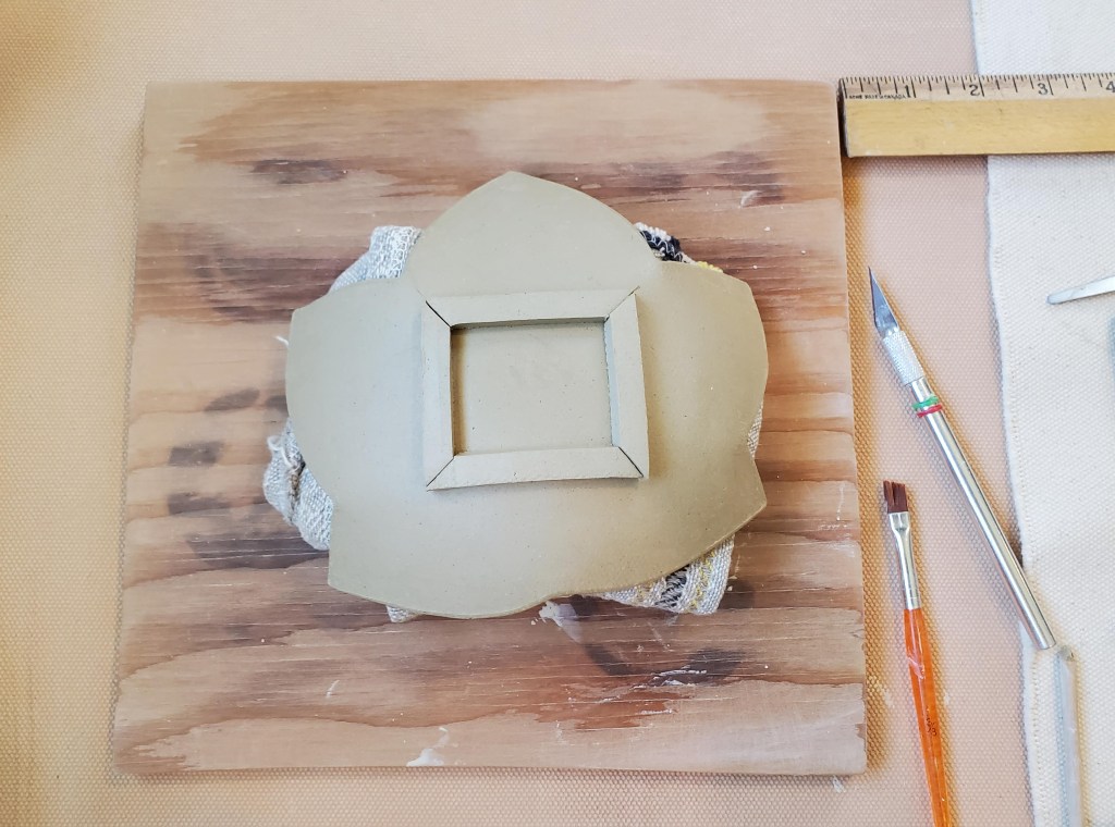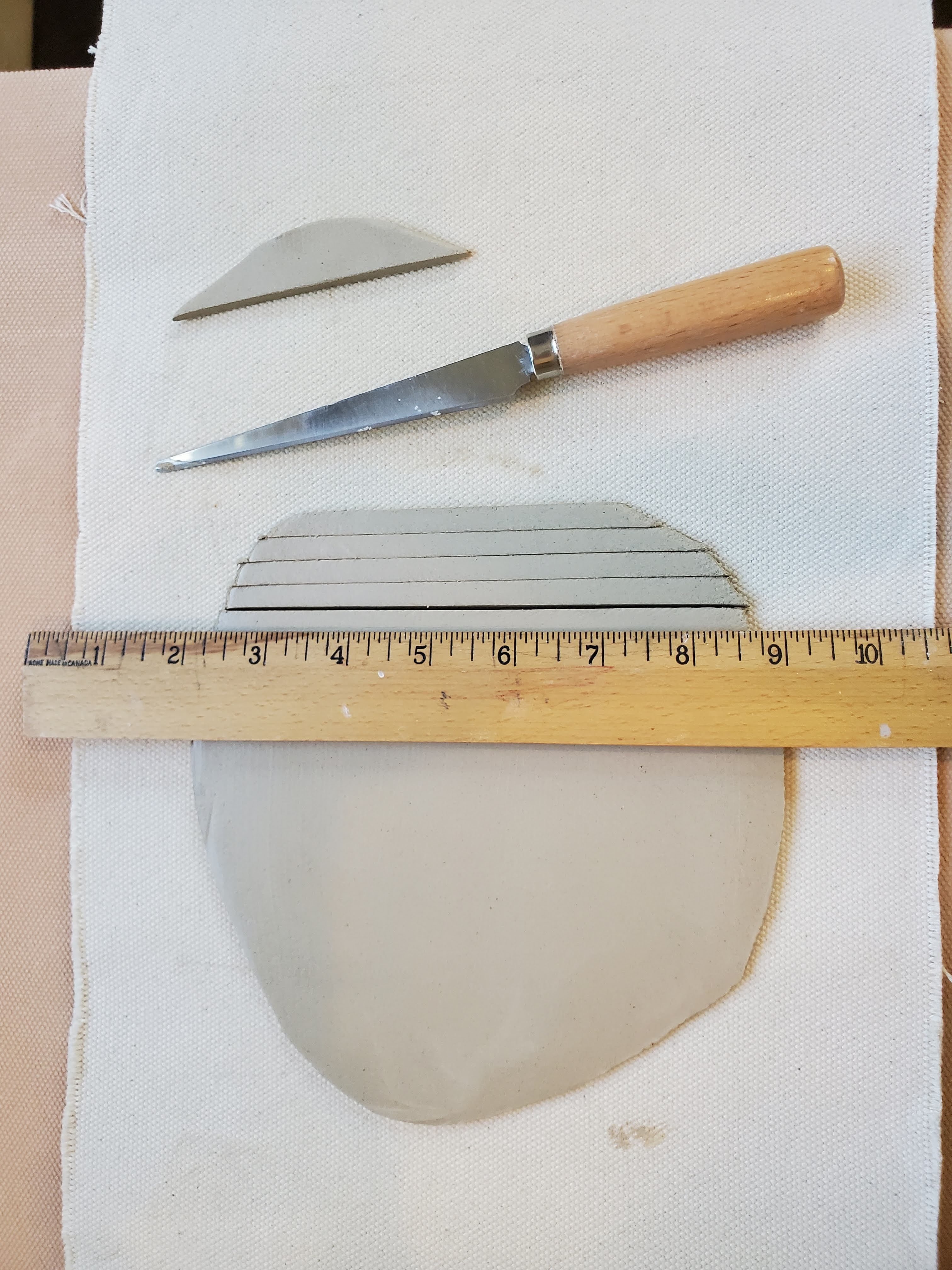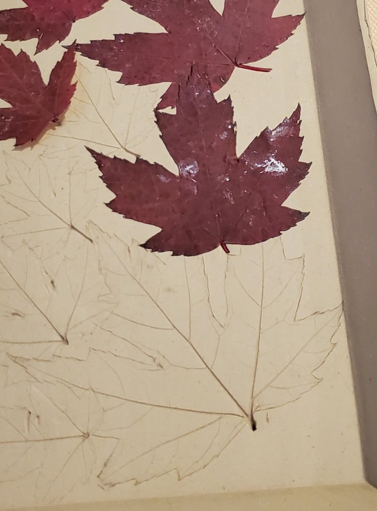 The first step is to walk around the property and collect leaves. I’ve been using maple, thimble berry and yarrow leaves. Then I roll out a slab of clay and smooth and compress it before placing the leaves on it and rolling over it again with a rolling pin. It turns out that clay slabs are super finicky and any rough treatment will come back to haunt you during firing! So much warping! After the first firing I paint an underglaze on to the surface and then wipe it almost completely off, so that the color remains only in the texture and leaf veins. The final step is an all over application of translucent green glaze.