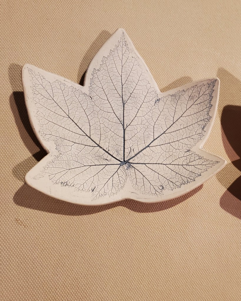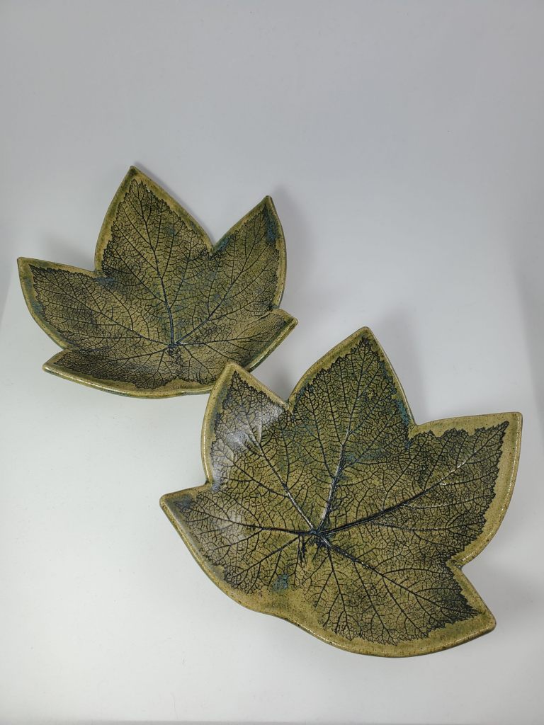 My thimbleberry dishes are made pressing individual thimbleberry leaves into a prepared slab and then cutting around the leaf. I add feet to give it a stable base. I use a similar under and over glaze technique to bring out the detail in each leaf.