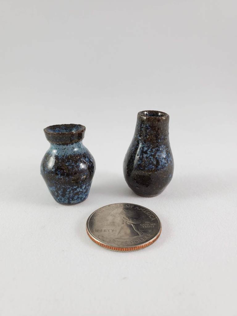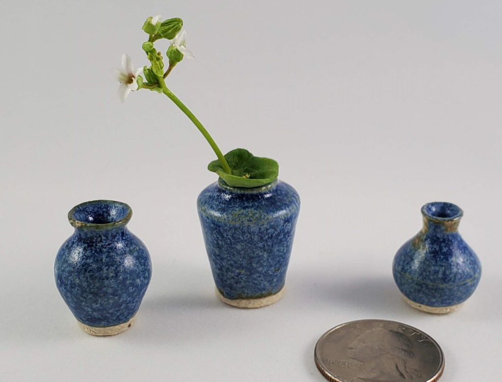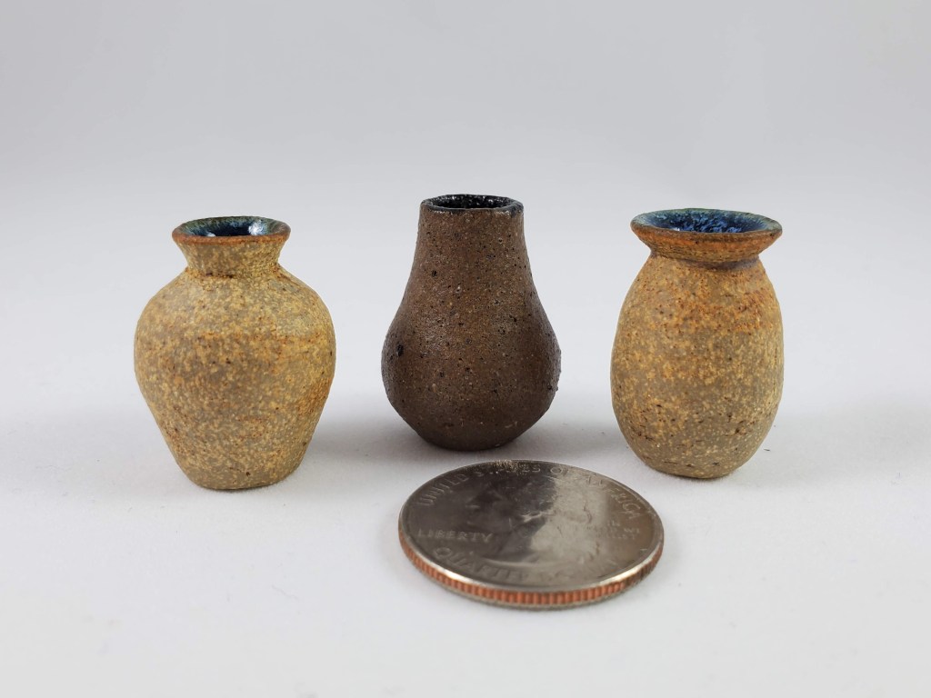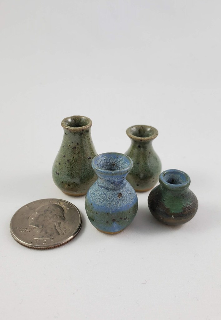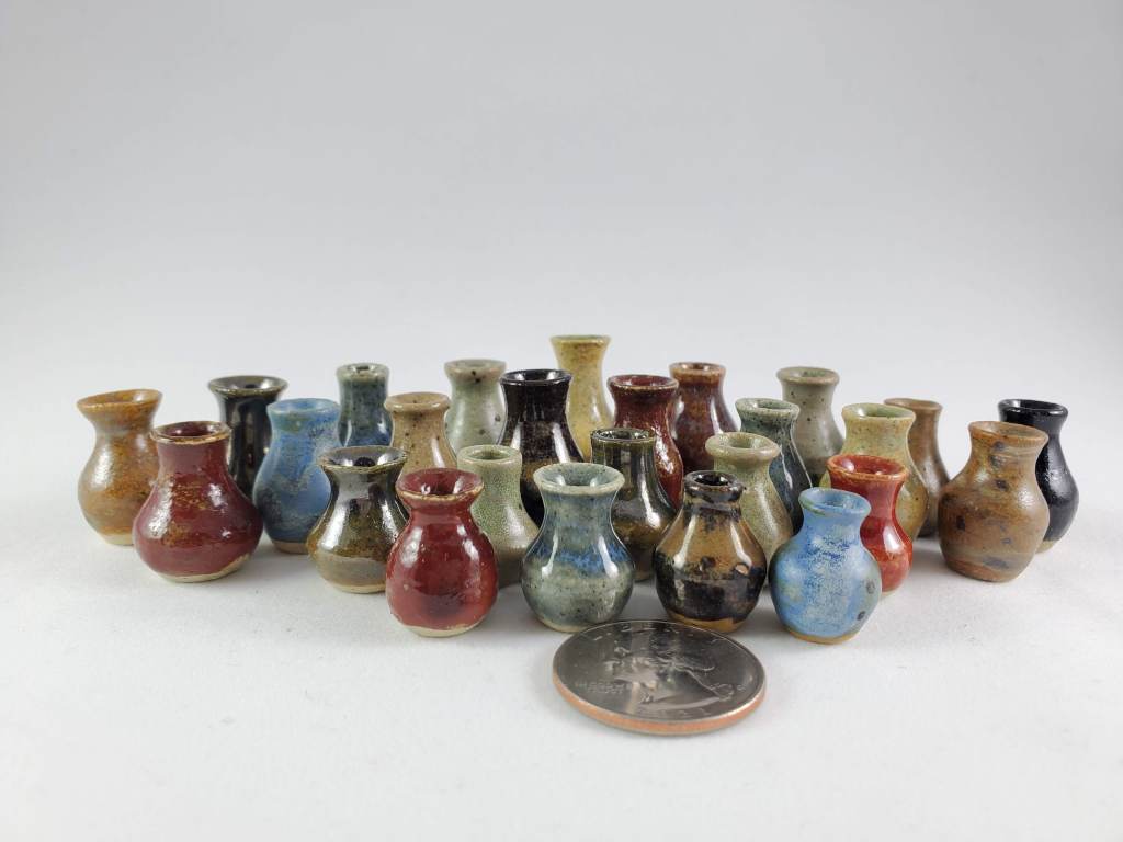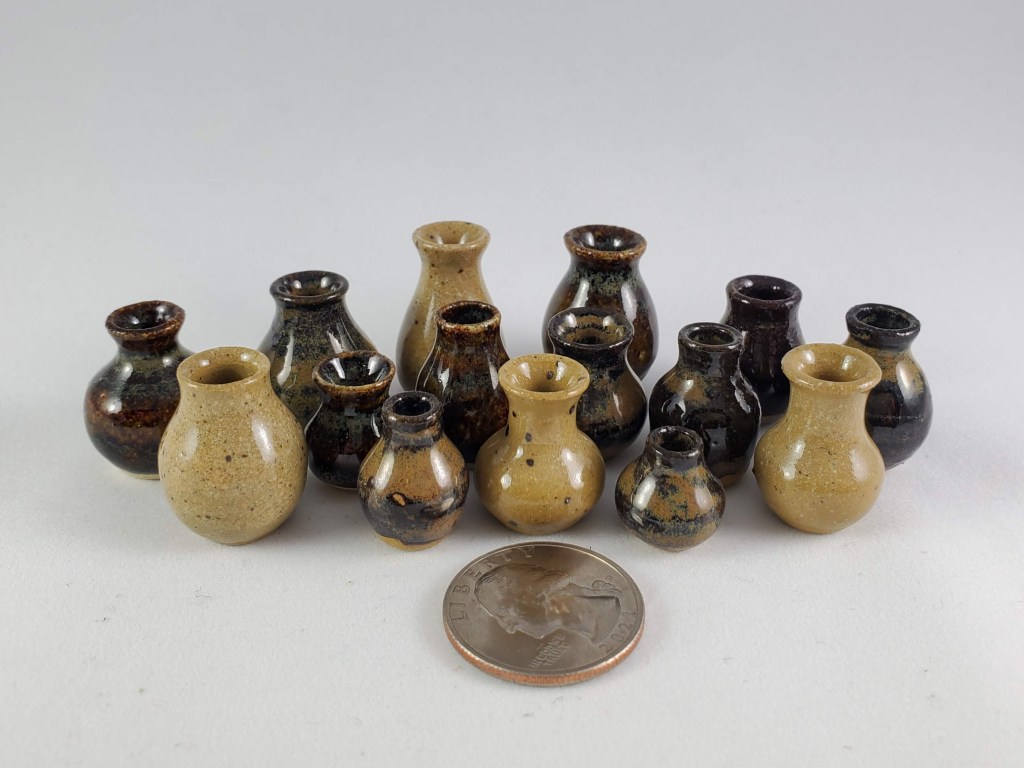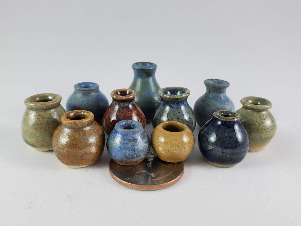 The tiniest of my collection. These are all thrown off the hump on a standard pottery wheel. I use my pinkie fingers, a straight pin, and sometimes an orange cuticle stick!
